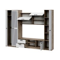 - Гостиная состоит из трёх модулей (шкаф платяной, шкаф бельевой, средняя секция), которые при желании можно устанавливать отдельно друг от друга, размещая в разных комнатах